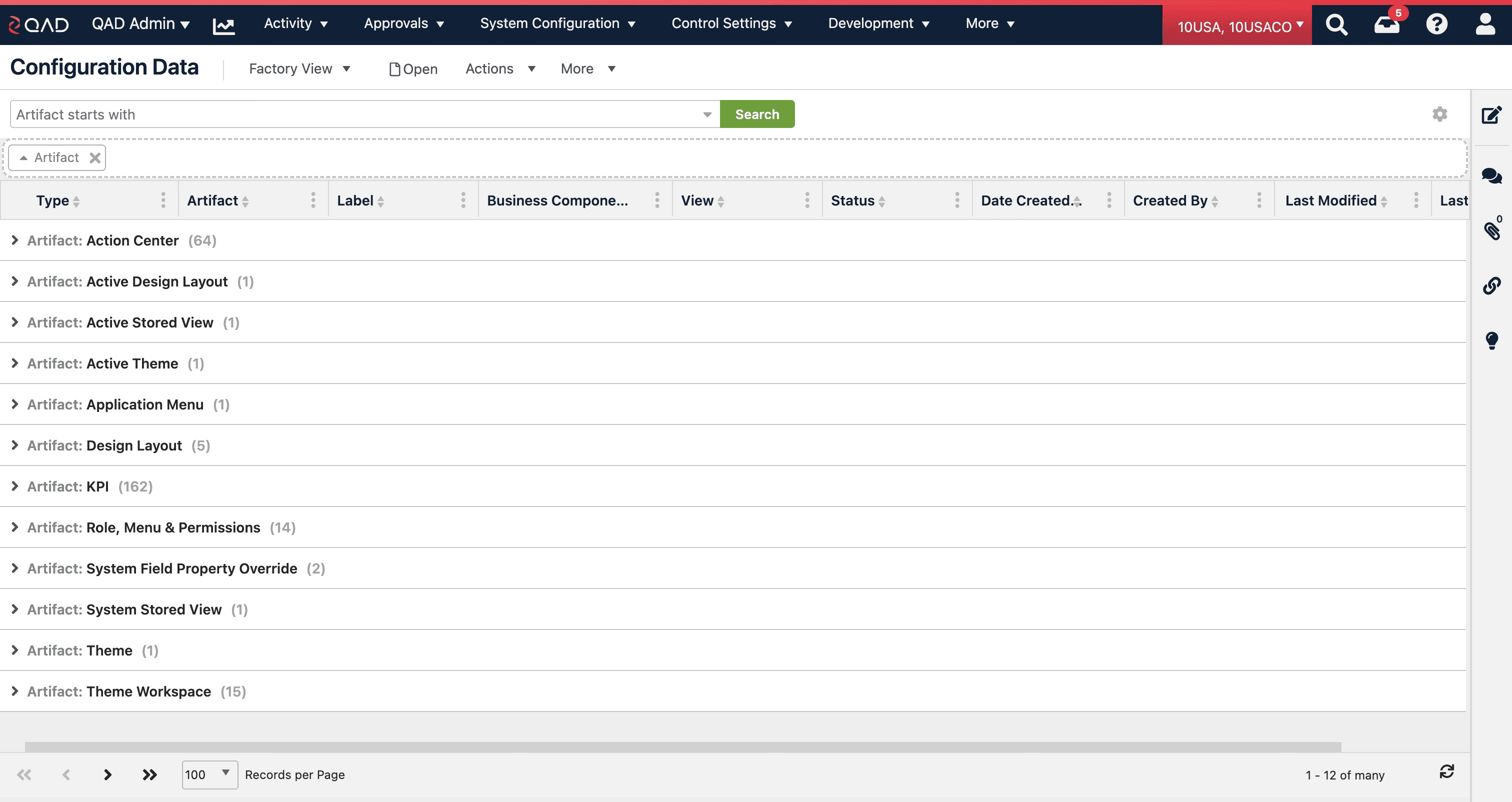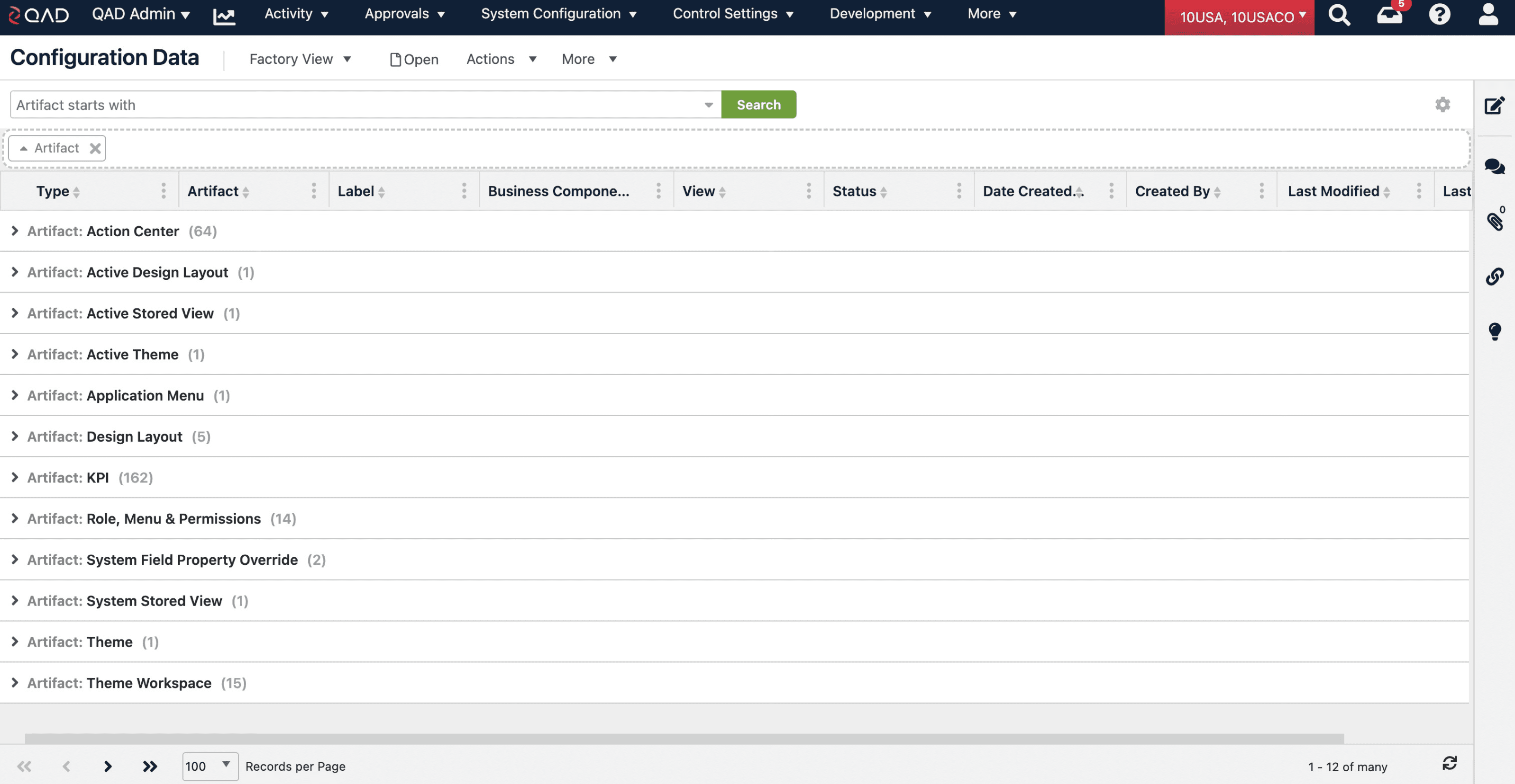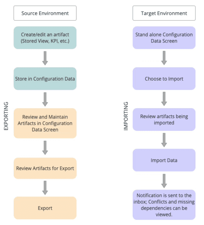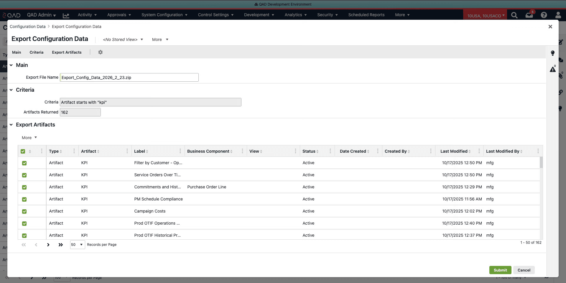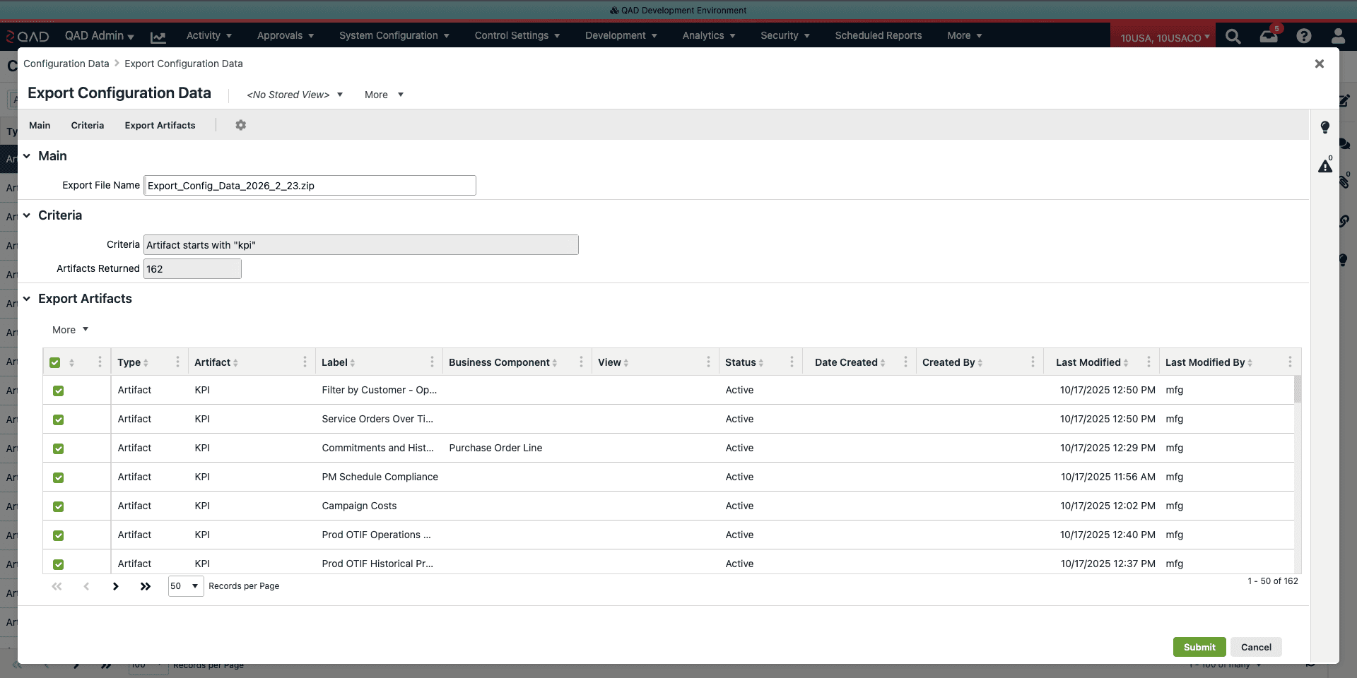 Data from Configuration Data can be filtered based on the users needs: Date Created, Status, Artifact Type, Artifact Name, etc. Then those selected artifacts are reviewed in the Export screen before being added to a zip file for download.